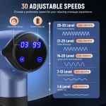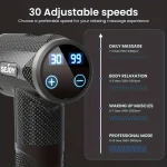 • 30 SPEEDS & LCD TOUCH SCREEN Gun Massager With 30 adjustable speed levels (1200 – 2800 percussions/min), you can freely choose the speed according to the degree of your muscle soreness or pain. At the same time, our massage gun massager is equipped with an LCD touch screen that displays the speed levels and the amount of electricity.