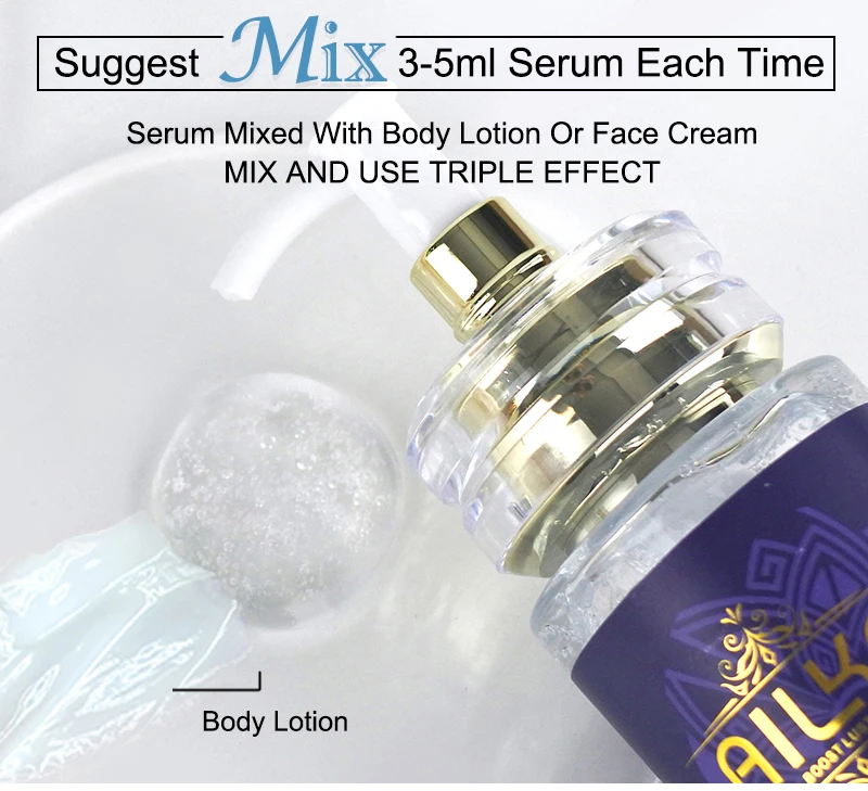 2.Suggest 3-5ml serum each time, the serum mixed with body lotion or face cream, which achieving triple effect